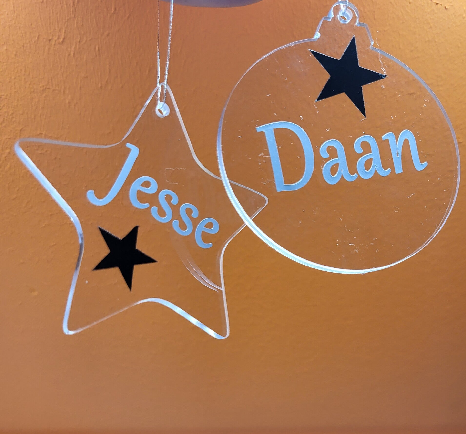 Leuke plexiglas kersthanger in de vorm van een kerstbal of Kerstster. Ook te personaliseren.